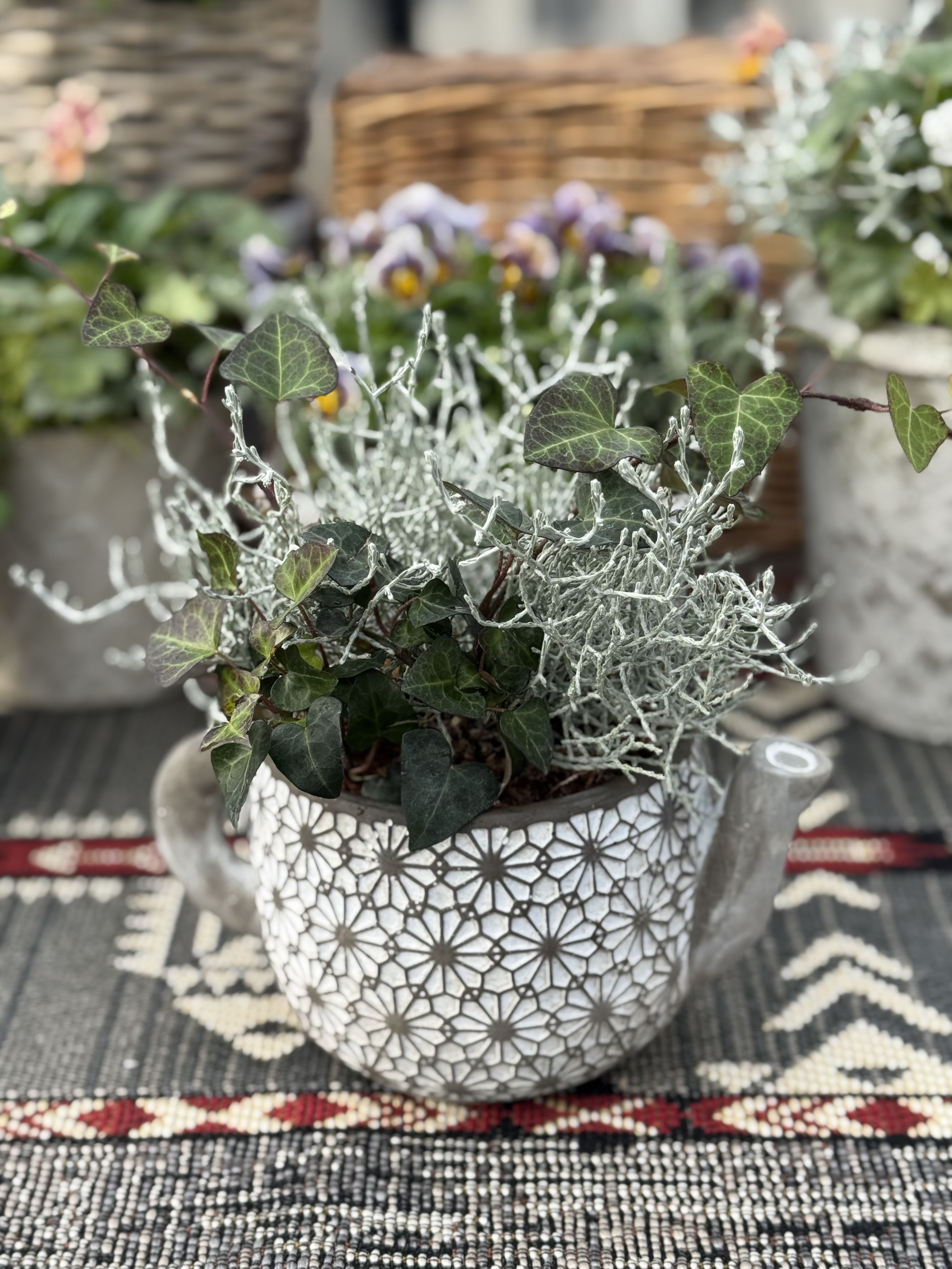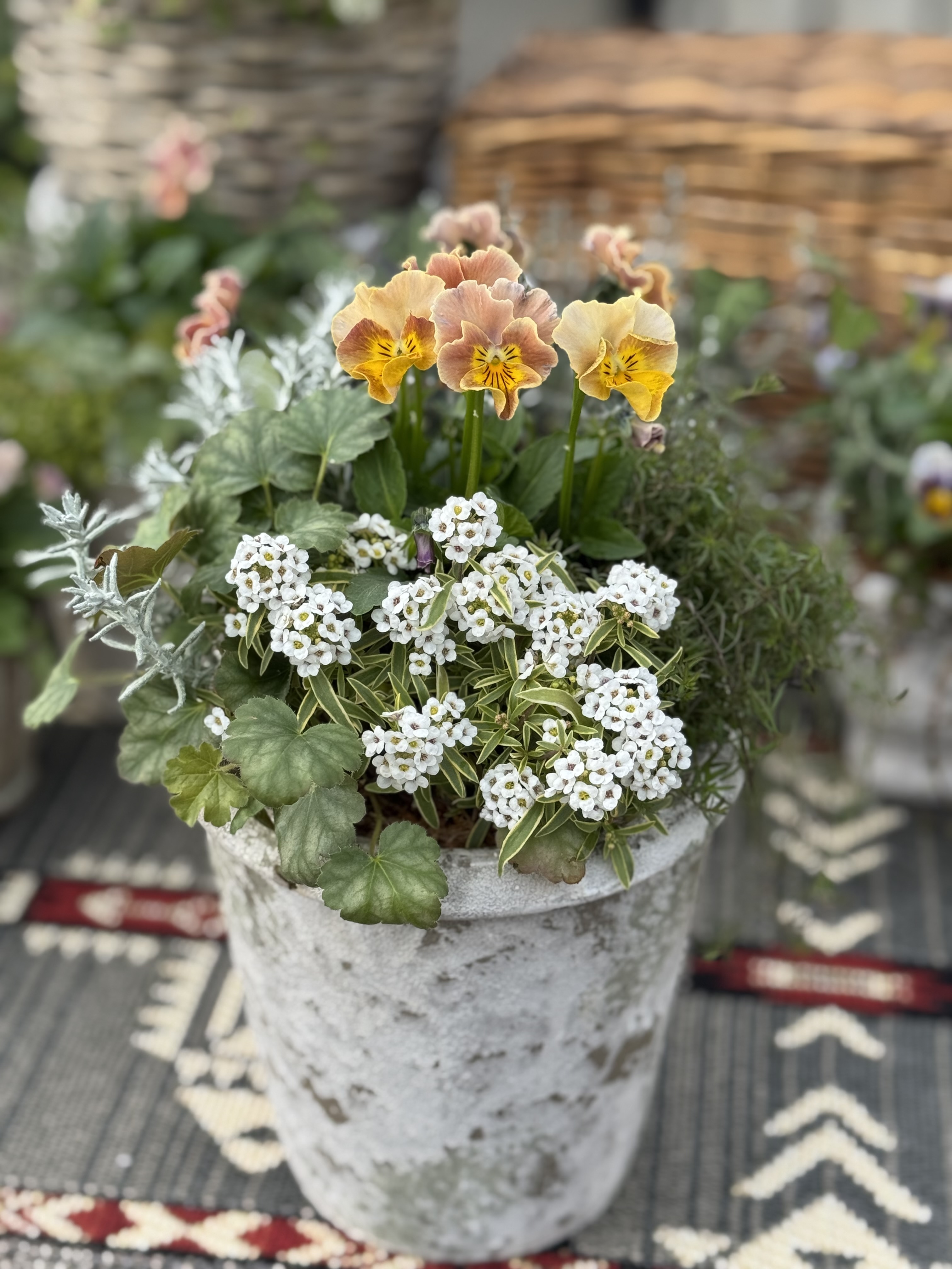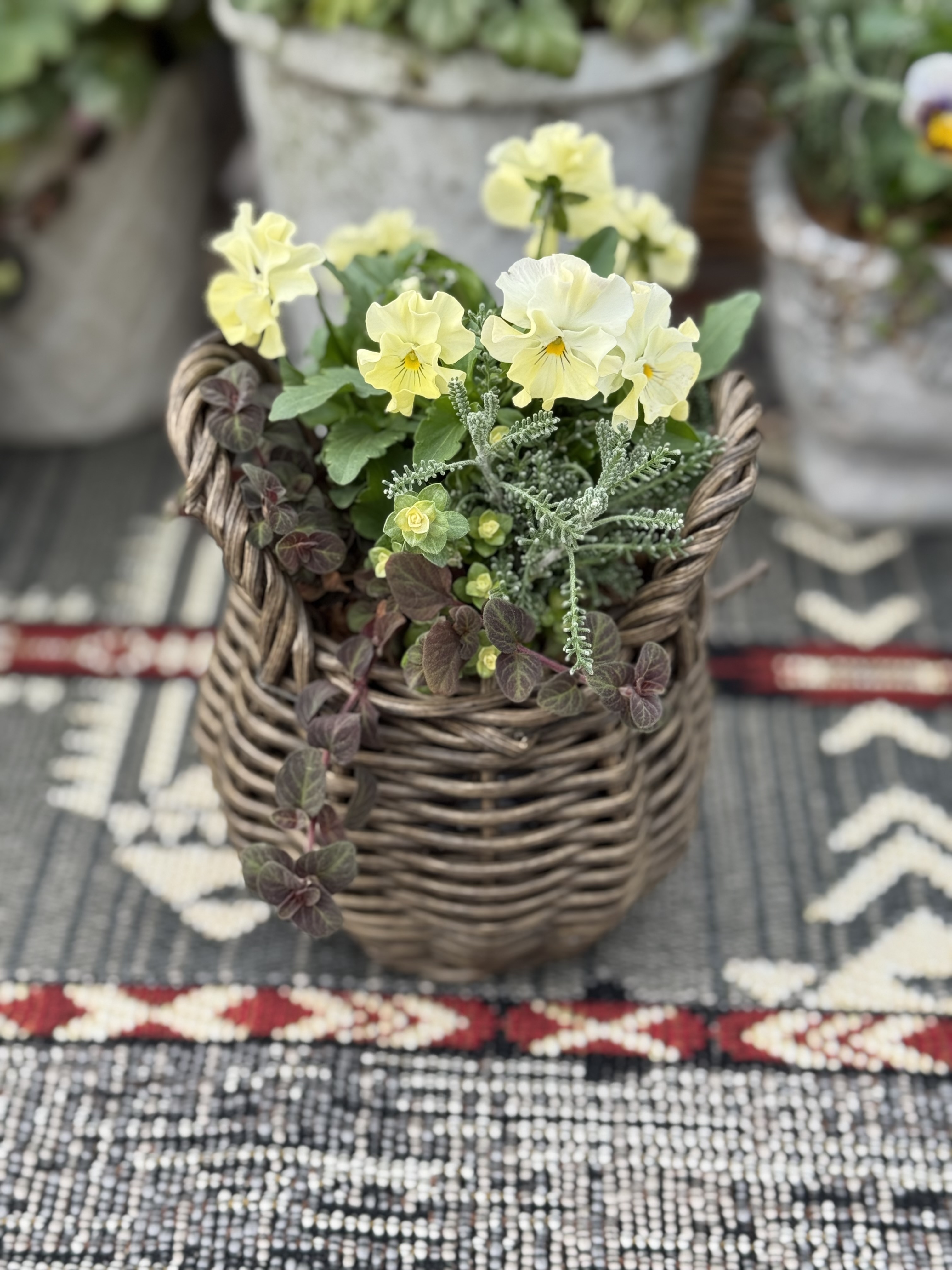 《生きたお花の小さなアレンジメント》 根のあるお花をバスケットやブリキ、陶器の鉢にに寄せ植えます。