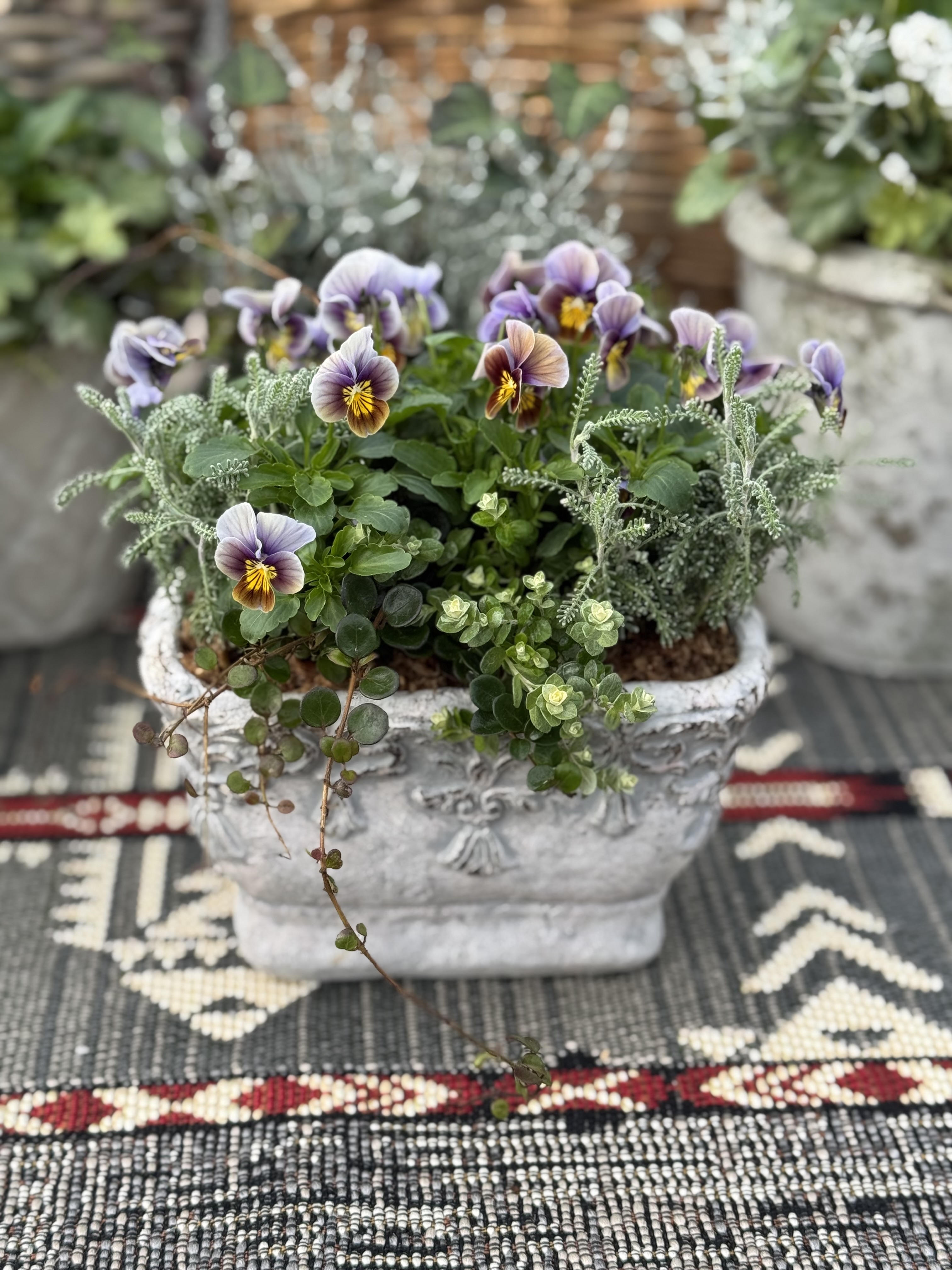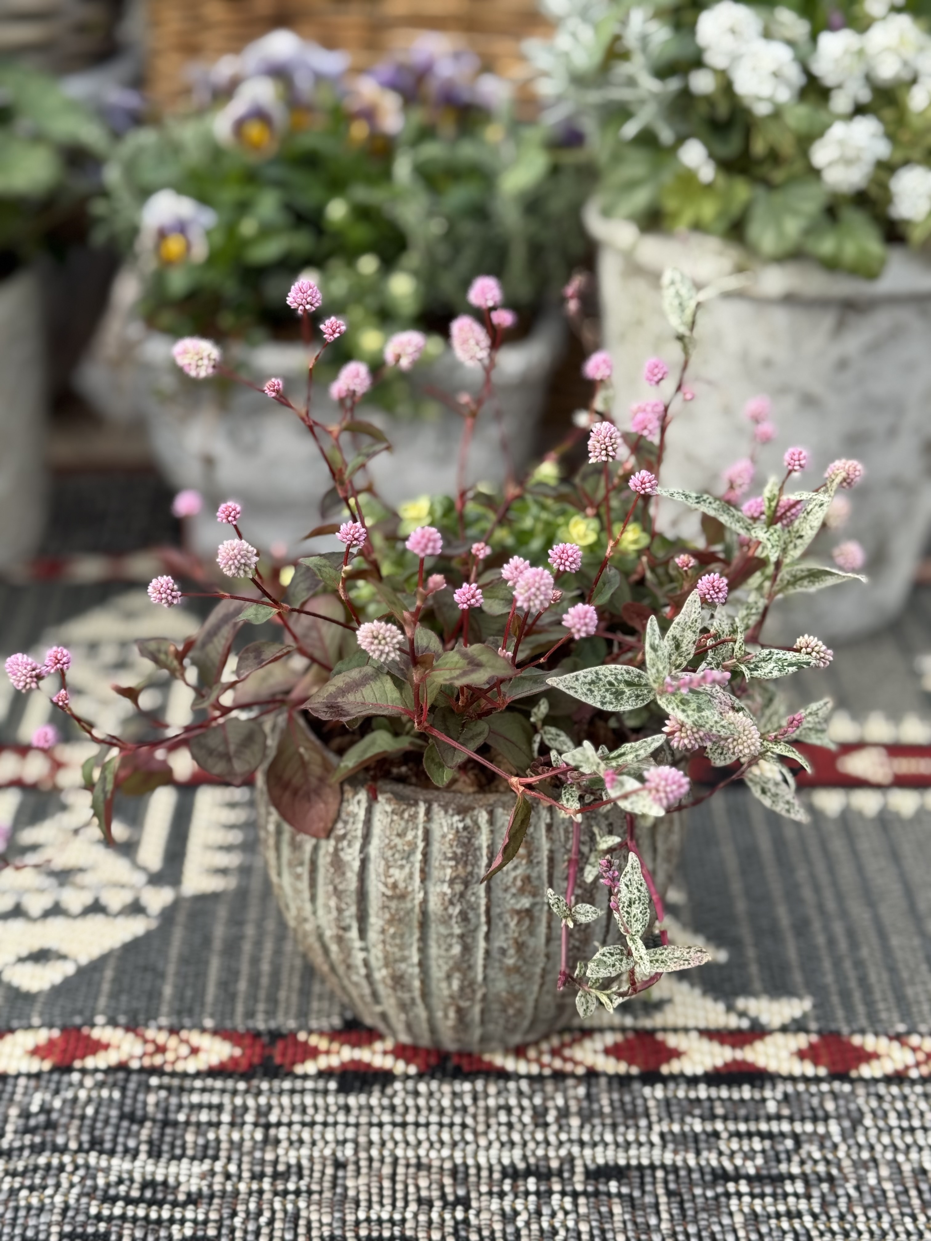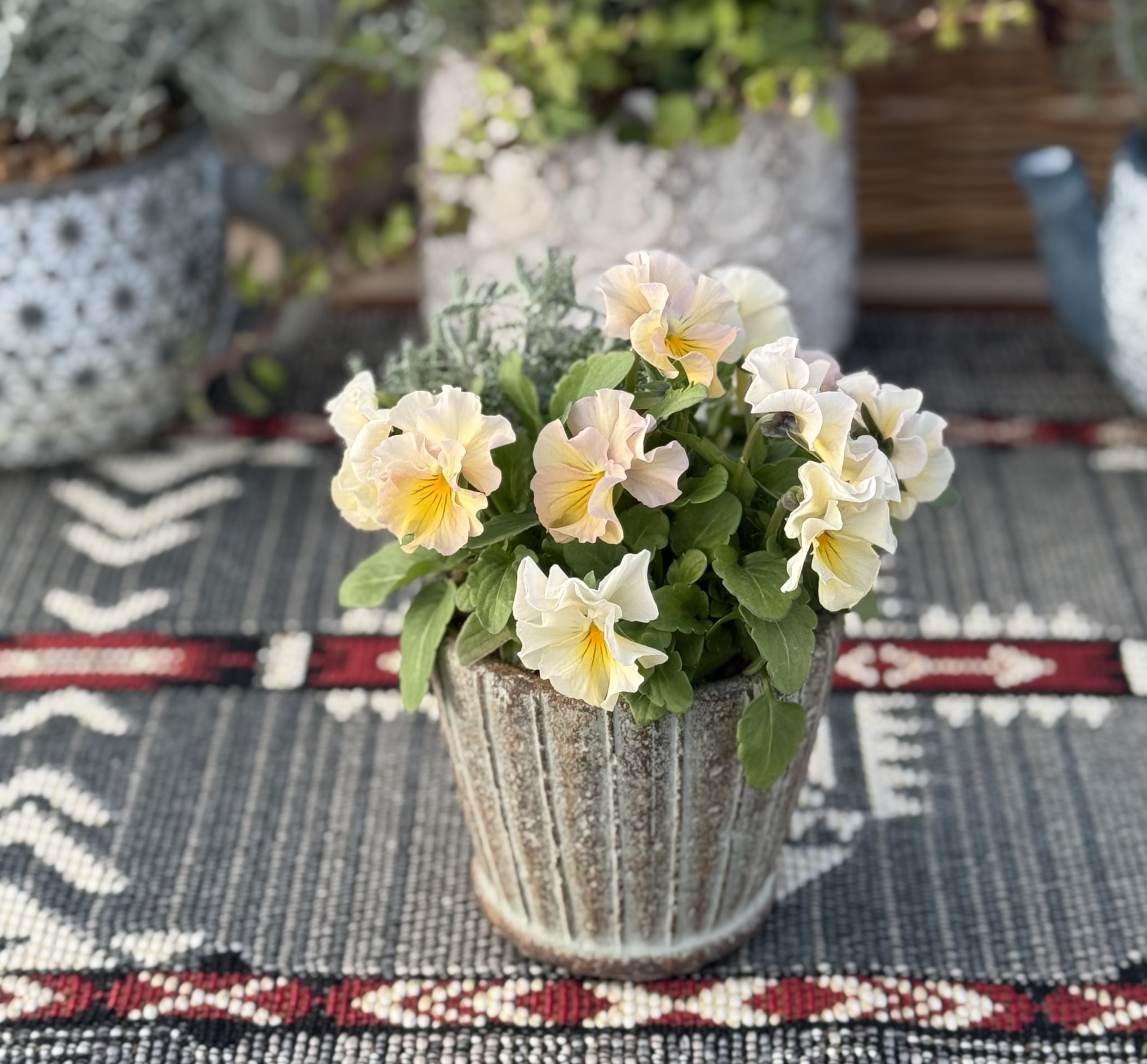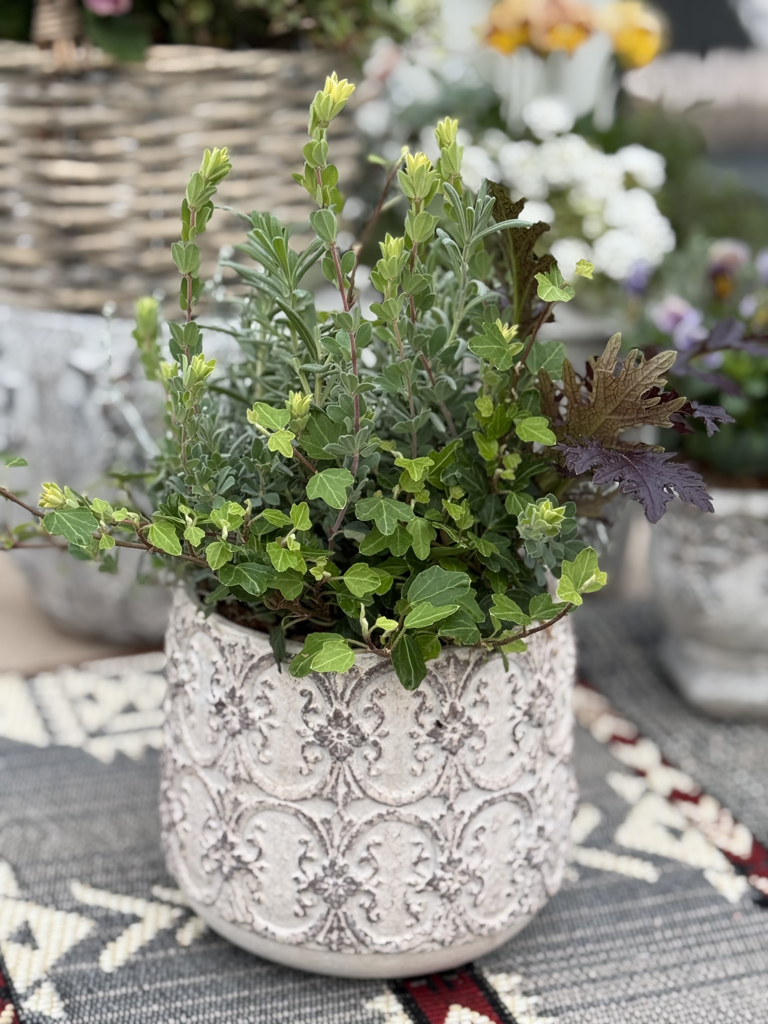 《生きたお花の小さなアレンジメント》 根のあるお花をバスケットやブリキ、陶器の鉢にに寄せ植えます。