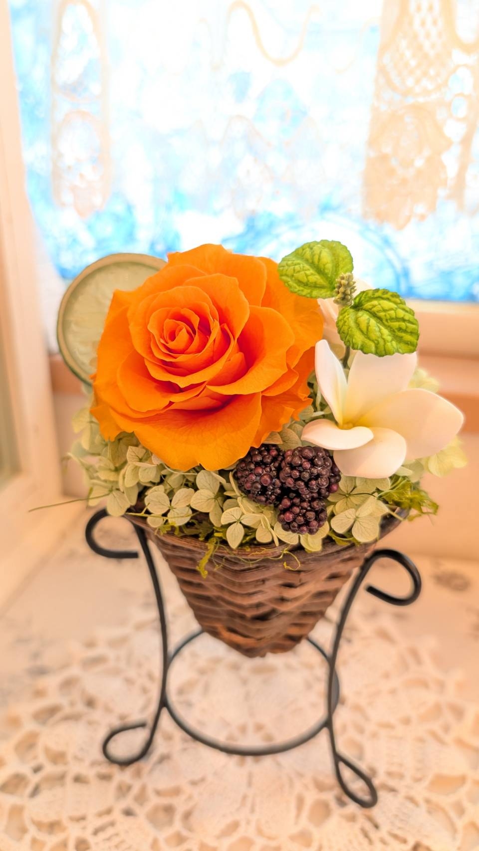 個性豊かな羊毛マスコットと華やかで可愛らしいプリザーブドフラワーアレンジ作品です