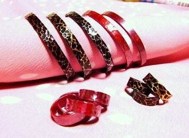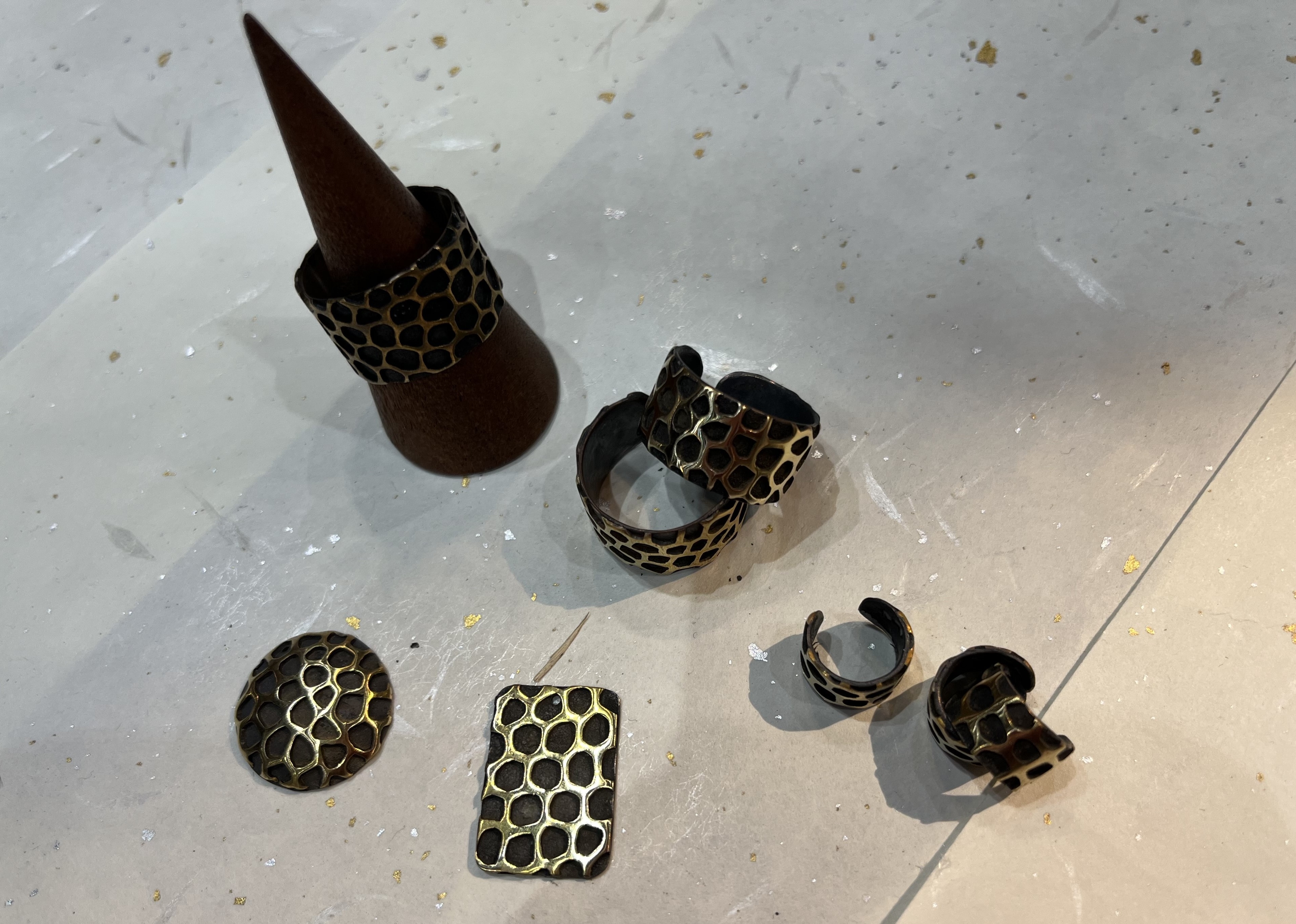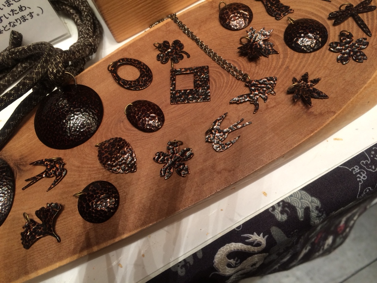 銀は象嵌七宝や寄せ金風細工、銅は緋銅や稲わら燻し、真鍮は糸のこの手技、鉄はブルースチール。塗装やコーティング剤を使用せず、伝統的技法を用いた古の日本を感じさせる華やかな彩の装飾品。