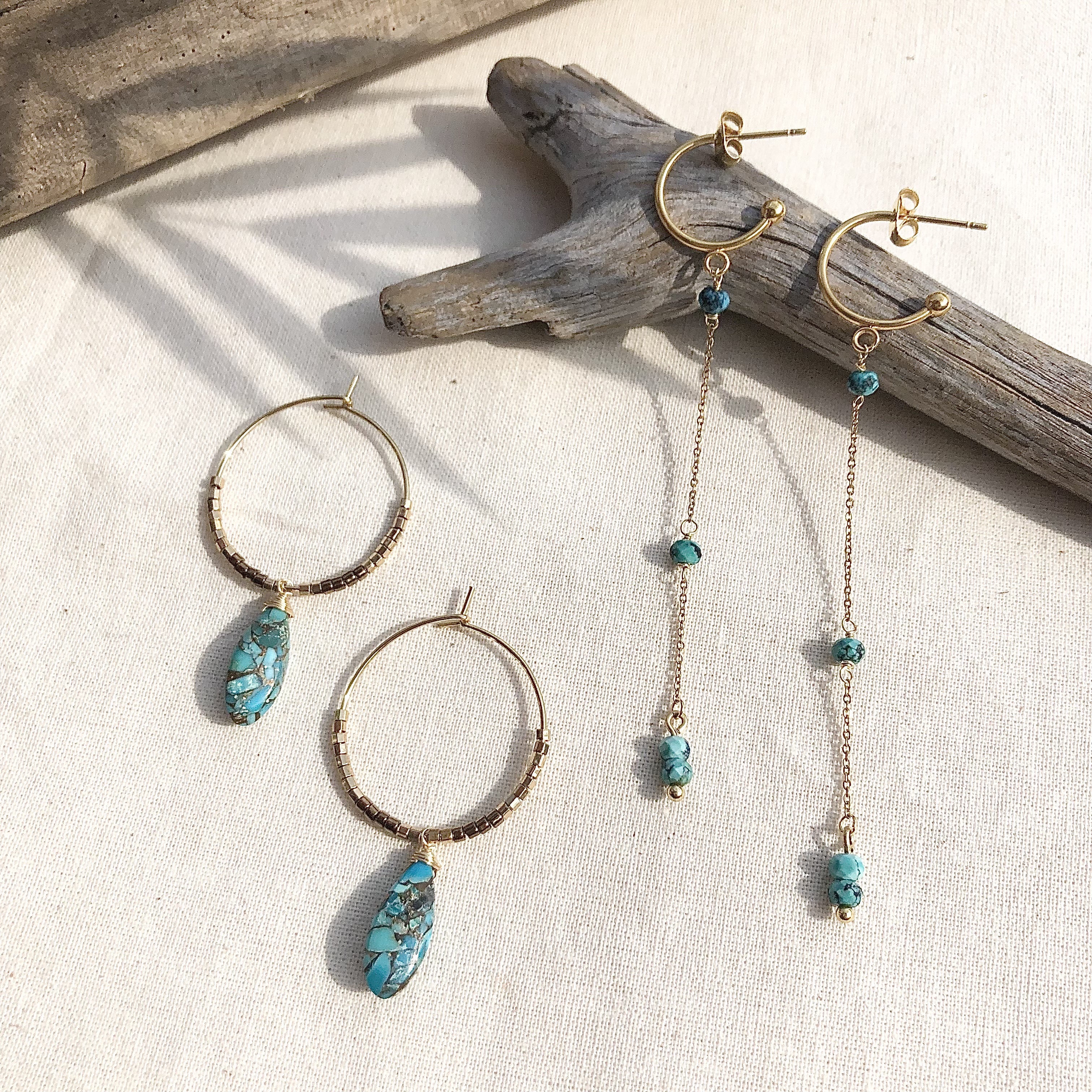 貝殻に手描きデザインをほどこしたアクセサリー。天然石やマクラメアクセサリーもご用意してお待ちしております!(その場でイアリング変更可)