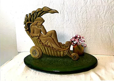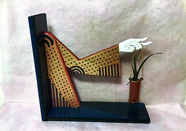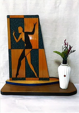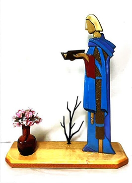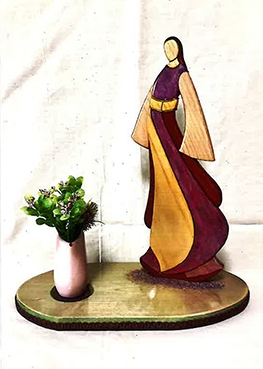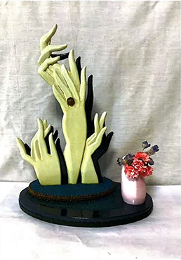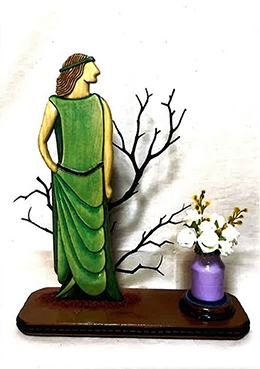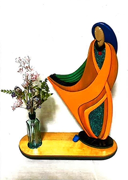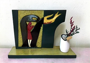 切り抜いた朴の板や水槽用の流木等を脱色・染色したものにガラス瓶や石粒を施して制作。どの作品にも一輪挿しを添えてアクセントとした。