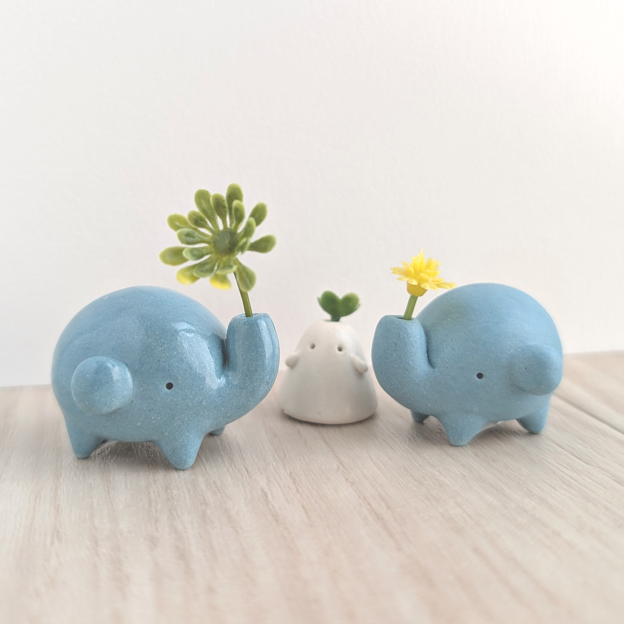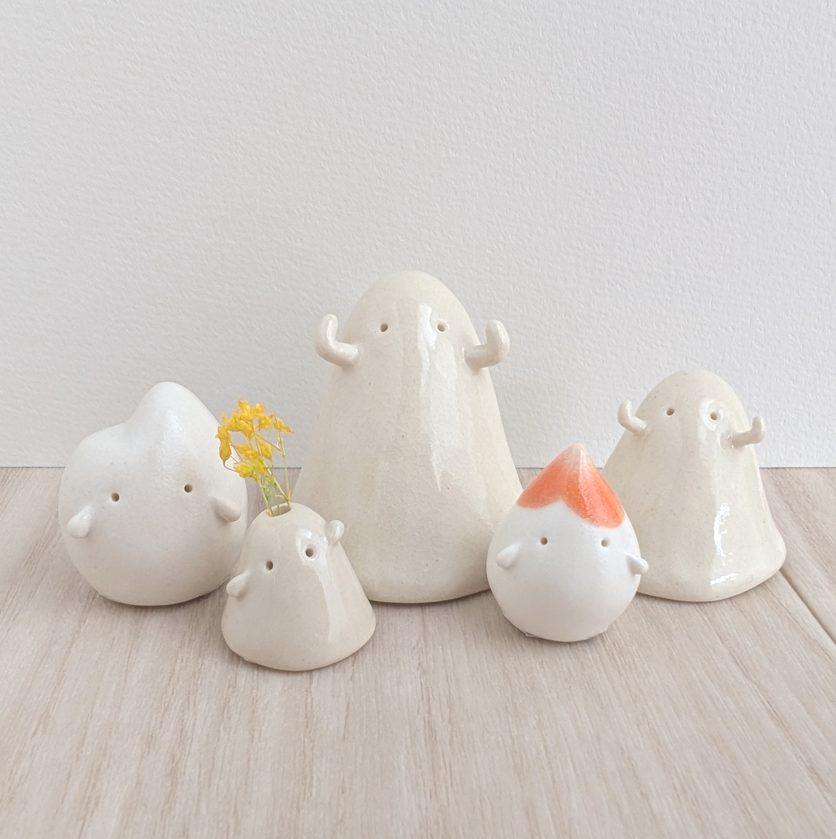 「おばけ」の一輪挿し(置き物)を中心に、「おこめ」「かめさん」「ぞうさん」筆をモチーフにしたキャラクター「ふでで」などの陶器の置き物を制作しています。 その他、おばけの頭にさせる飾りや、アクセサリー、マグネットなども作っています。 誰かの日々の癒しとなれるような作品をめざして、日々制作しています。