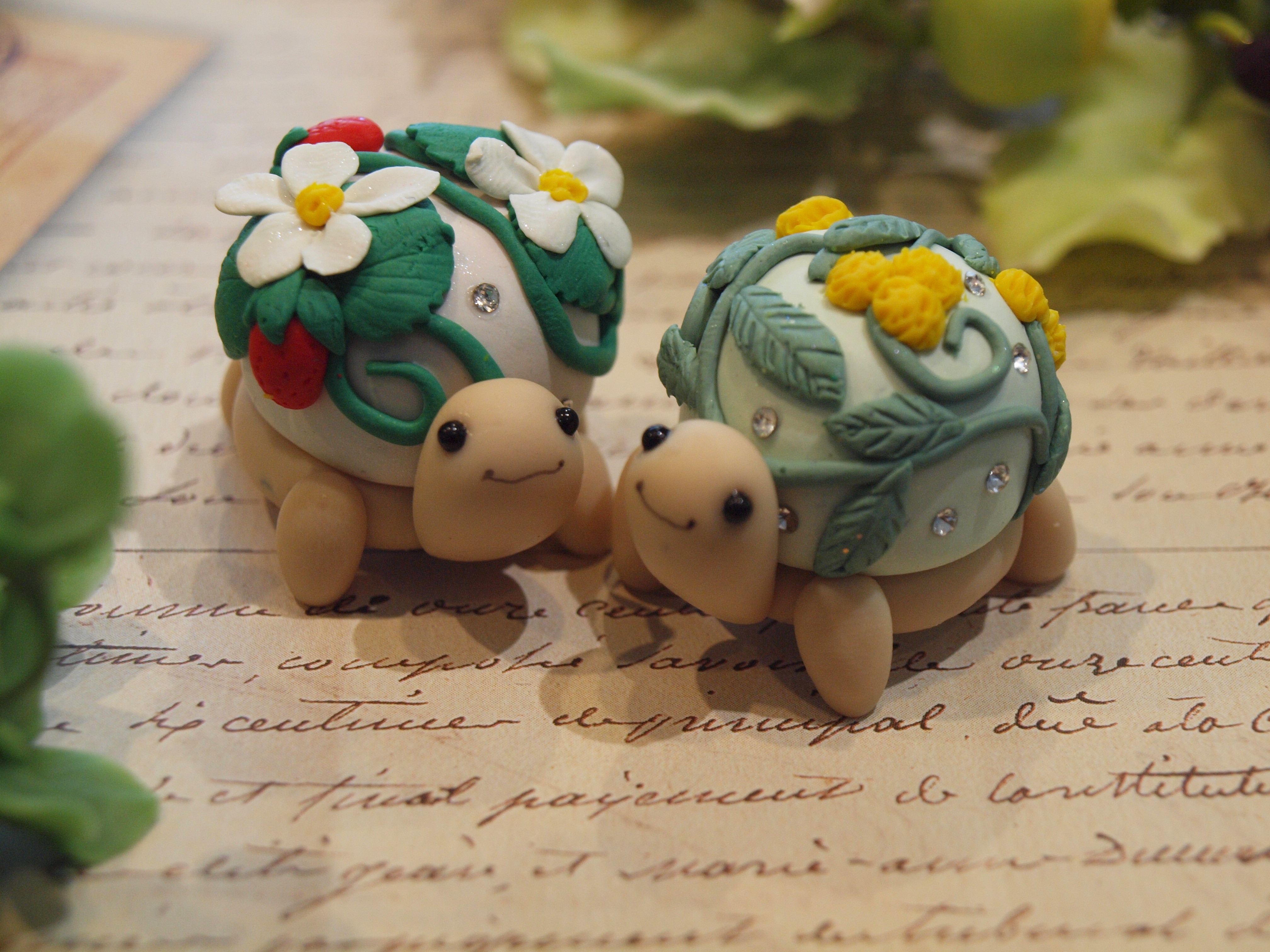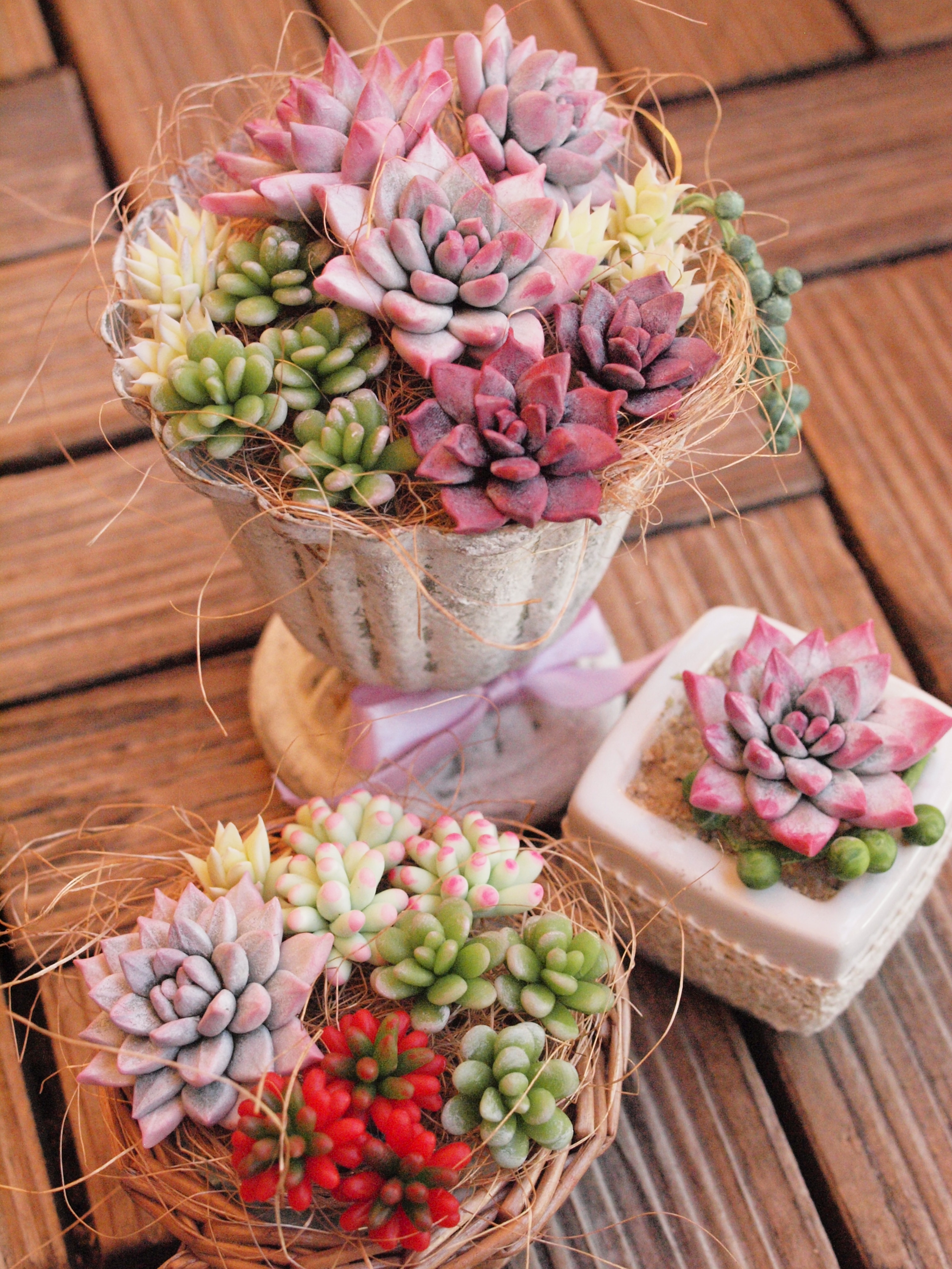 樹脂粘土で制作したお花や多肉植物を用いた置物や雑貨、ポリマークレイ(オーブン粘土)で制作したアクセサリーや置物