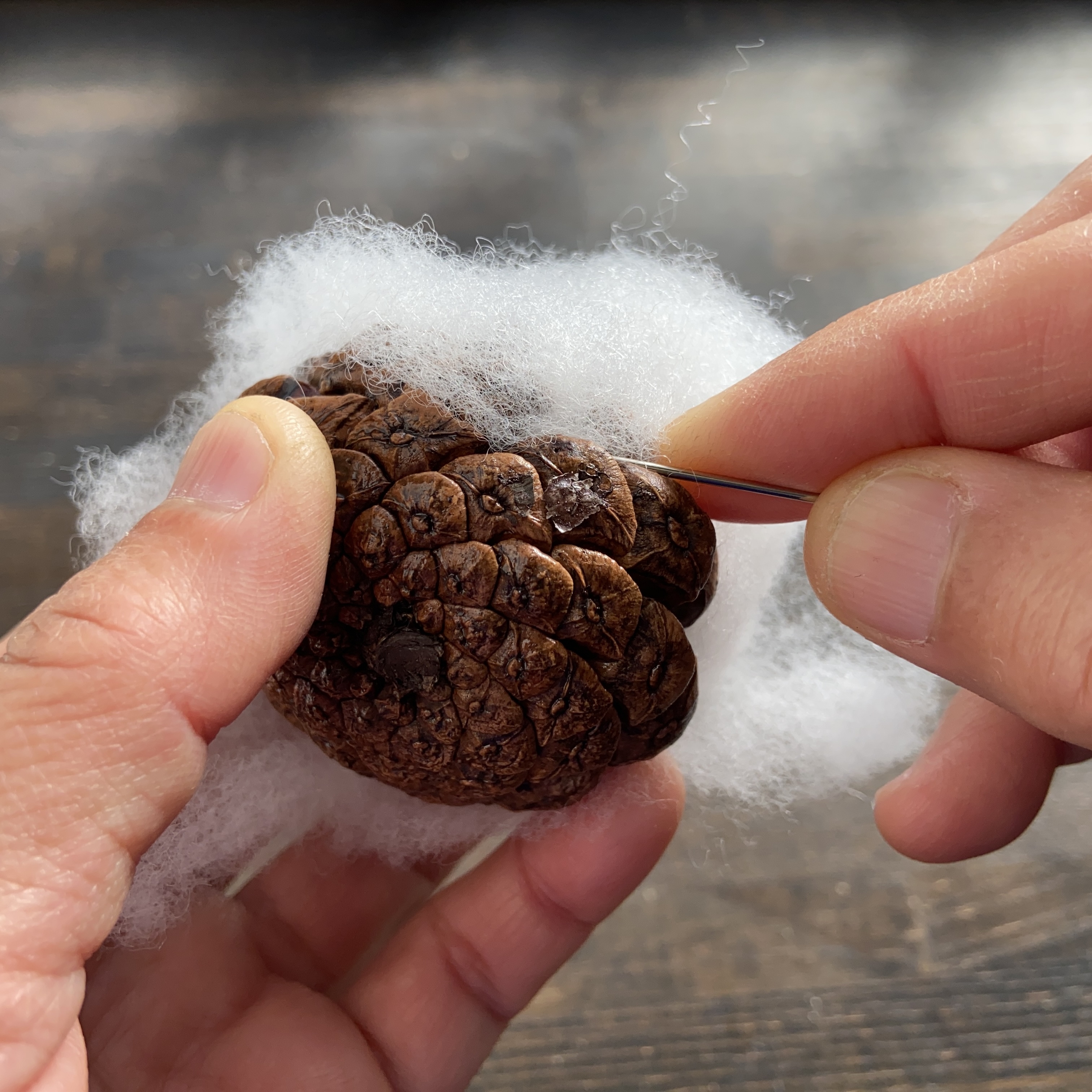 松ぼっくりと手芸わたを使って、かわいいシマエナガを作ろう!毛糸針とボンドを使用、約10分でできます。