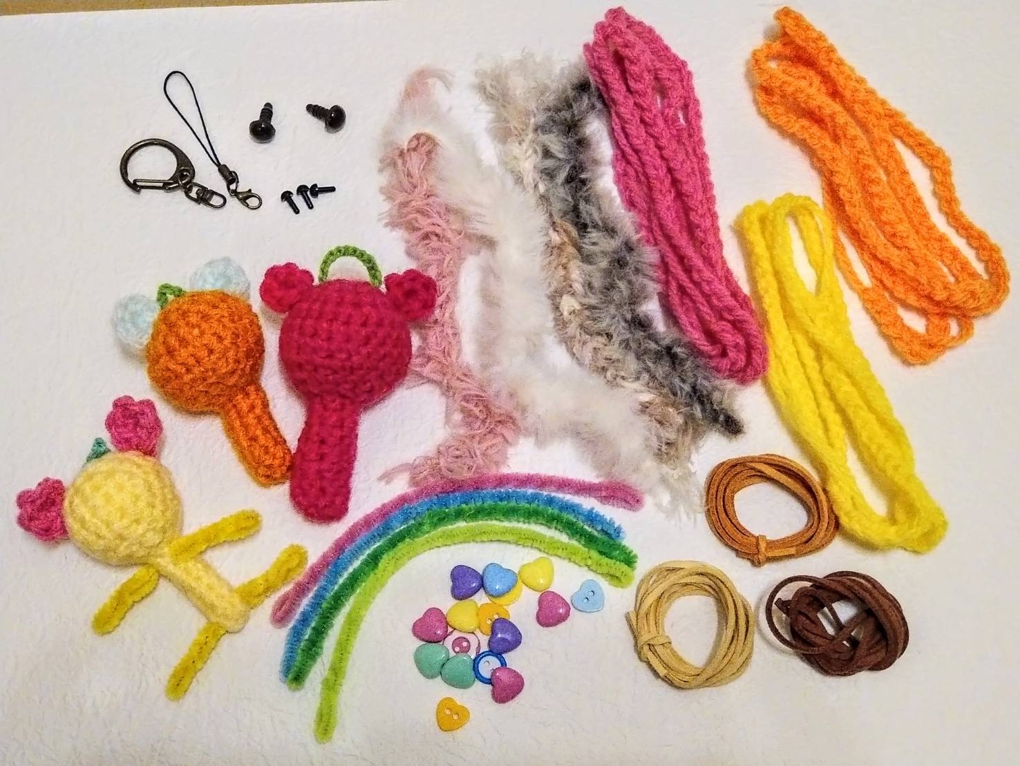 1・編みぐるみ本体を選ぶ 2・目・鼻・ネックストラップを選ぶ 3・ボンドでつける 以上です。
